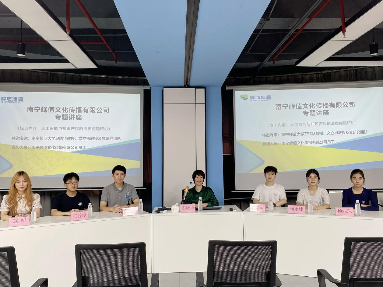 知识产权法教学团队卫绪华副教授受邀到南宁峰值文化传播有限公司(以下简称“峰值公司”)作《人工智能与知识产权的法律问题研讨》专题讲座,法律系文立彬副教授和数名学生一起参加讲座,此次讲座由峰值公司执行董事蒋林峰主持。