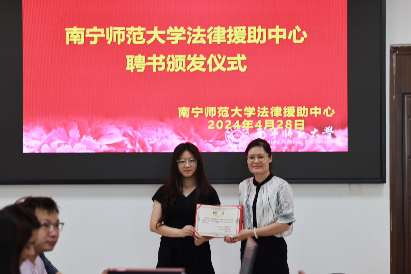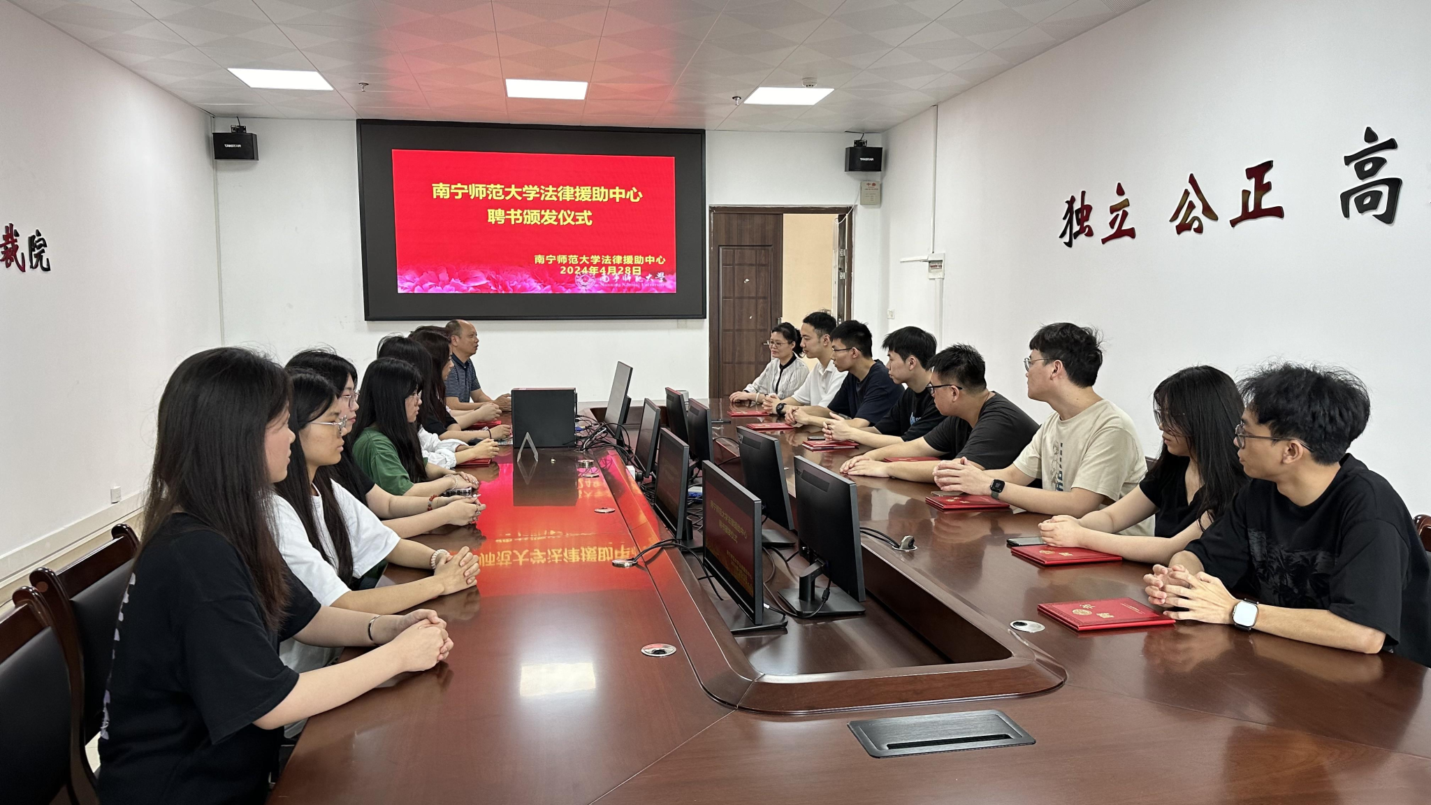 法律援助中心工作人员聘书颁发仪式在五合校区理综618教室举行,法律援助中心主任卢明威、副主任陈文琼出席了仪式。