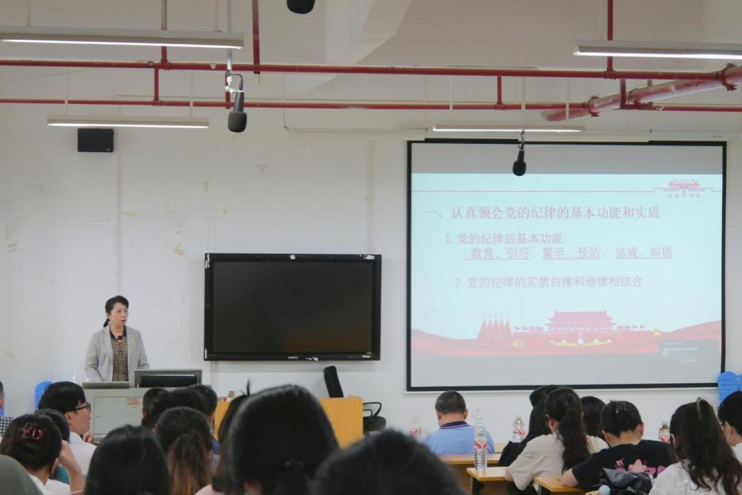 党委书记许建同志在五合校区文楼601为全体师生党员讲授党纪学习教育专题党课,主题为“全面从严治党必须切实严明党的纪律——把党纪学习教育融入日常、抓在经常”。本次课程共分三部分,旨在通过授课、观看警示教育片的形式,让党员同志提高政治站位、加强政治意识,切实将党纪学习内化于心、外化于行。