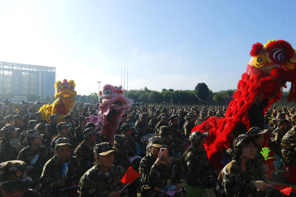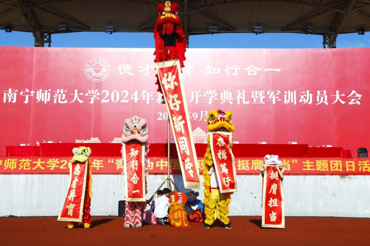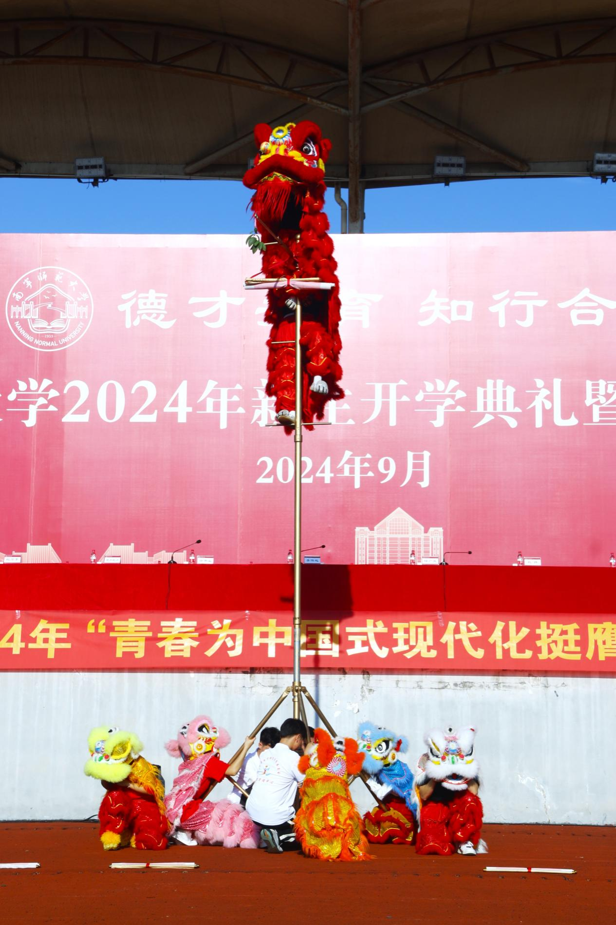 在表演中,醒狮矫健地跃上高杆,精准地摘取悬挂于顶端的“青”,精彩的表演不仅展现了舞狮艺人精湛的技艺,也深刻寓意着新生们面对挑战时,那份无畏的勇气与坚定的决心。期待2024级学子们在今后的求学之路上,如这醒狮一般,满怀信心与勇气,迎难而上,通过勤奋学习、积极实践,实现自我价值,书写属于自己的辉煌篇章。