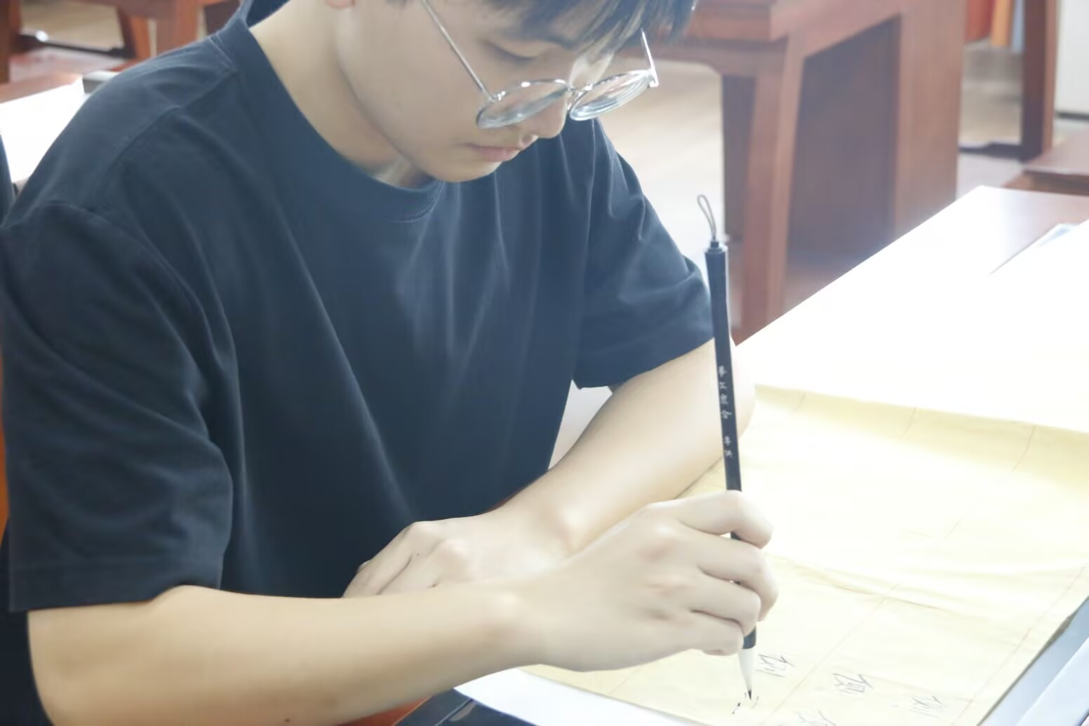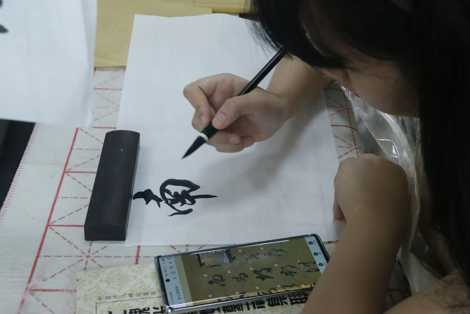 在杨东东老师的带领下,学院将书法实训室作为工作坊,同学们在翰墨飘香中领略书法之美。当笔触“亲近”宣纸那一刻,仿佛每一个汉字都被这墨香塑造了骨架,注入了灵魂。