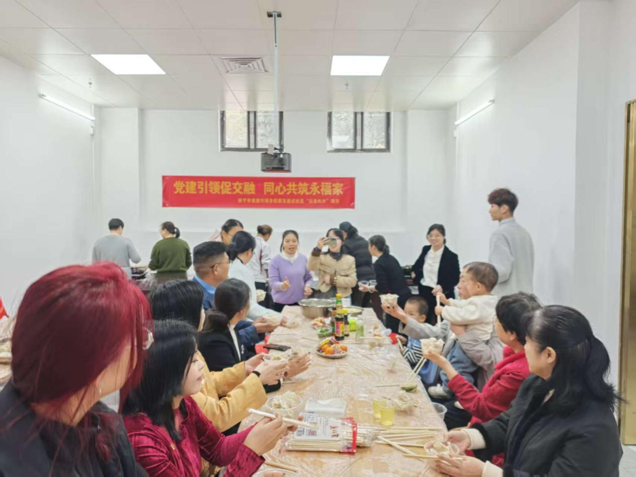 活动现场暖意融融、笑语盈盈,来自不同民族的居民们围坐一堂,在烟火气中拉近距离。本次茶话会以“共制美食、共享家味”为创新载体,让居民成为活动的主角。大家热情高涨、分工协作,和面、拌馅、包饺子,动作娴熟默契;有居民主动现场展示油茶熬制技艺,茶汤的醇厚香气萦绕全场,成为跨民族文化交流的独特符号。动手劳作间,大家自然畅谈各自民族的饮食传统、节庆习俗与家乡趣事,在味蕾的碰撞与心声的交融中,悄然打破文化隔阂,让“各民族一家亲”的共同体意识在并肩协作、真诚分享中愈发浓厚。一位参与居民动情说道:“今天不仅尝到了南北各异的地道风味,更结识了许多新邻居、新朋友,心里满是温暖,真切感受到社区就是我们共有的大家庭。”