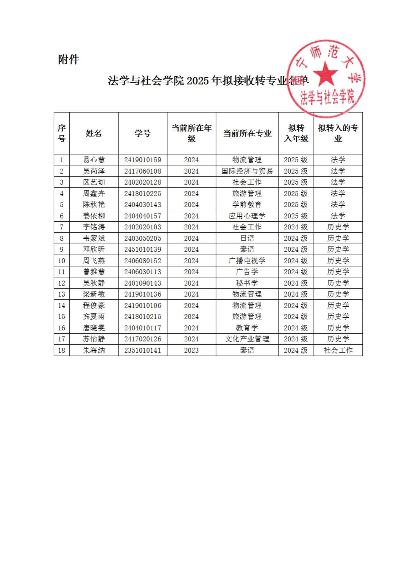 2025年法学与社会学院转专业工作方案》要求,法学与社会学院对全校申请转入我院法学专业28人、历史学专业29人、社会工作专业1人分别进行考核。经考核,拟同意以下18名学生的转专业申请。现将名单予以公示(详见附件)。