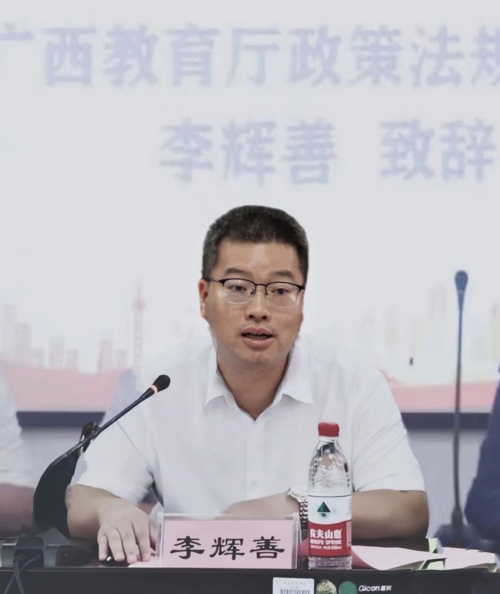 在开幕典礼上,广西教育厅政策法规处李辉善处长发表致辞。他代表广西教育厅对远道而来的各位教育界同仁、法学专家、检察官以及奋战在法治教育一线的老师们表示热烈的欢迎和诚挚的谢意。