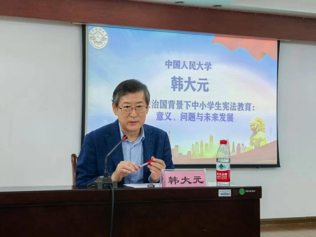 专题报告一:“全面依法治国背景下中小学生宪法教育:意义、问题与未来发展”,由中国人民大学青少年宪法教育研究中心学术委员会主任韩大元教授主讲。