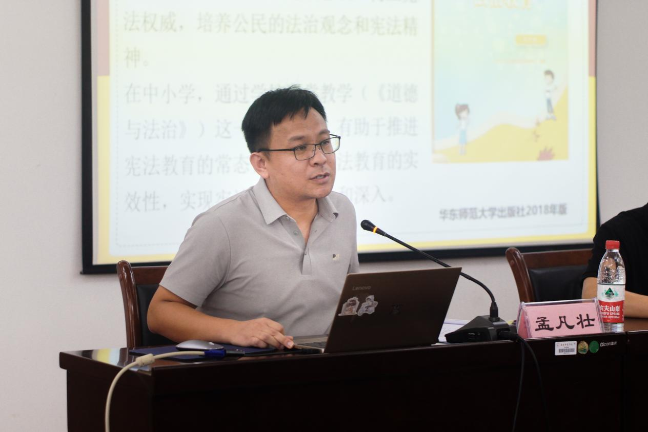华东师范大学法学院副教授孟凡壮,做了题为“通过案例教学推进青少年宪法教育”的主题发言。他首先介绍了宪法教育的定义和通过学校课堂教学推进宪法教育的重要性,然后以七年级下册道德与法治第十课第二框“我们与法律同行”为例,阐述了学习目标和重难点,并从为什么要树立法治意识和如何做到依法办事两个方面进行了探讨,提出推进法治中国建设是每个人的责任和义务,学生应在学习法律、遵守法律和依法维权等方面做出努力。
