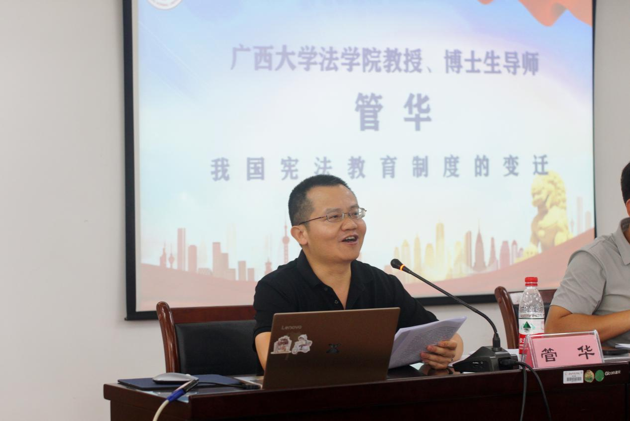 广西大学法学院教授管华做了题为“”我国宪法教育制度的变迁”的主题发言。他主要讲述了宪法教育制度的变迁,分为四个时期进行阐述:探索时期(1949 - 1981)、重建时期(1982 - 1995)、发展时期(1996 - 2013)和独立的宪法教育制度建构时期(2014至今),认为中央提出“法治教育”概念,标志着独立宪法教育制度的开端,但独立宪法教育制度建构仍然面临挑战与机遇。