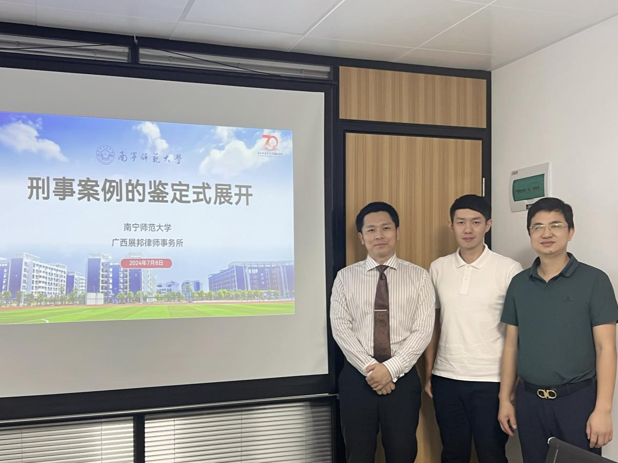 法律系文立彬副教授到实习实践基地广西展邦律师事务所开展刑事案例研讨活动。广西展邦律师事务所主任叶茂昌律师、执行主任潘其麟律师、高级合伙人赵万律师等数位资深律师参与了本次活动。
