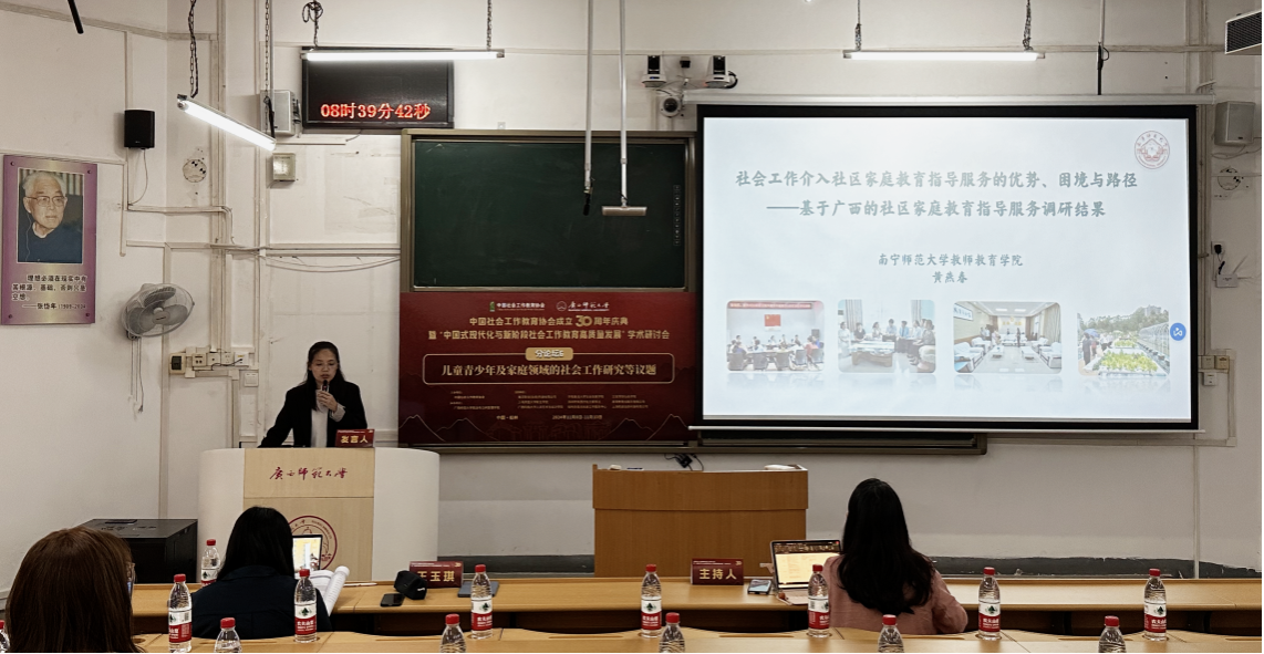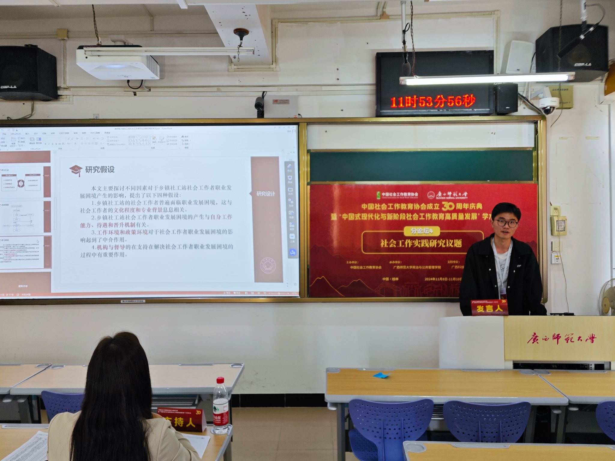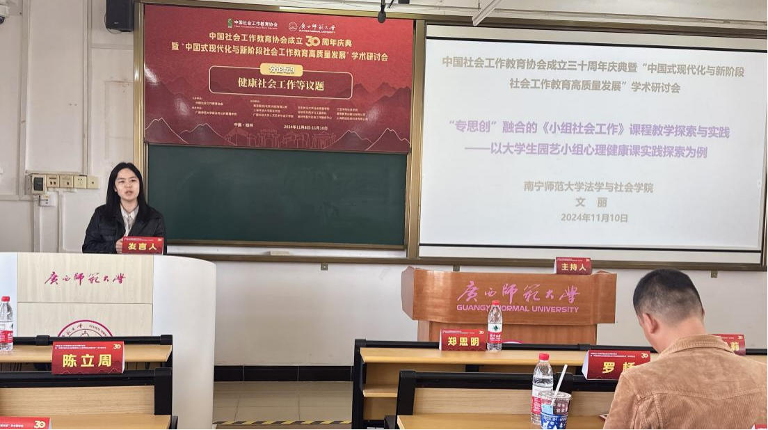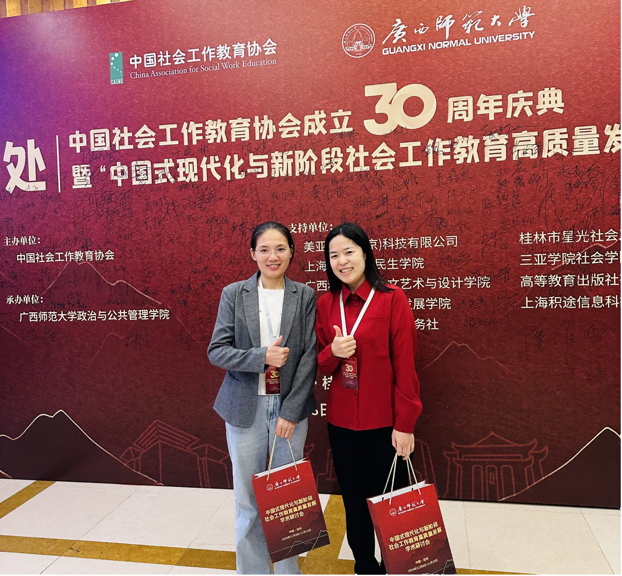 为深入学习贯彻习近平总书记关于社会工作的重要论述,推进中国式现代化背景下新阶段社会工作教育的高质量发展,2024年11月9日—10日,由中国社会工作教育协会主办、广西师范大学政治与公共管理学院承办的中国社会工作教育协会30周年庆典暨“中国式现代化与新阶段社会工作教育高质量发展”学术研讨会在广西桂林顺利召开。协会成员、广西壮族自治区党委社会工作部副部长郑胜景等出席了会议,来自全国各地社会工作专业高校师生、部分地方党委社会工作部代表、社会工作机构代表等近一千余人参加了论坛。主播福利 社会工作系教师袁锐、文丽,兼职教师黄燕春,以及24社工研究生潘辉煌、胡隆秉同学参加了会议,并在分论坛进行主题发言。