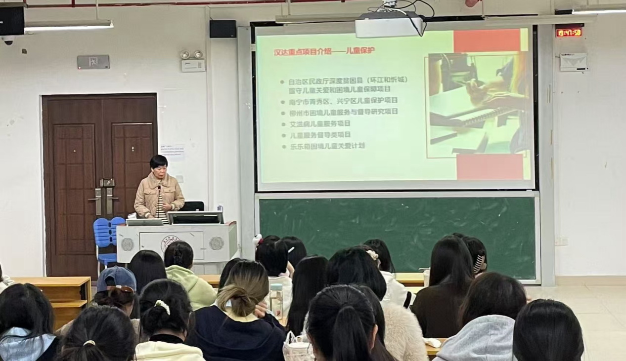2024年12月10日,我院社会工作系在五合校区文综楼901成功举办了一场主题为"社会工作服务项目分享"的学术讲座,由广西汉达社会工作服务中心创始人兼主任黄敏女士担任主讲嘉宾,活动吸引了广大师生前来聆听。
