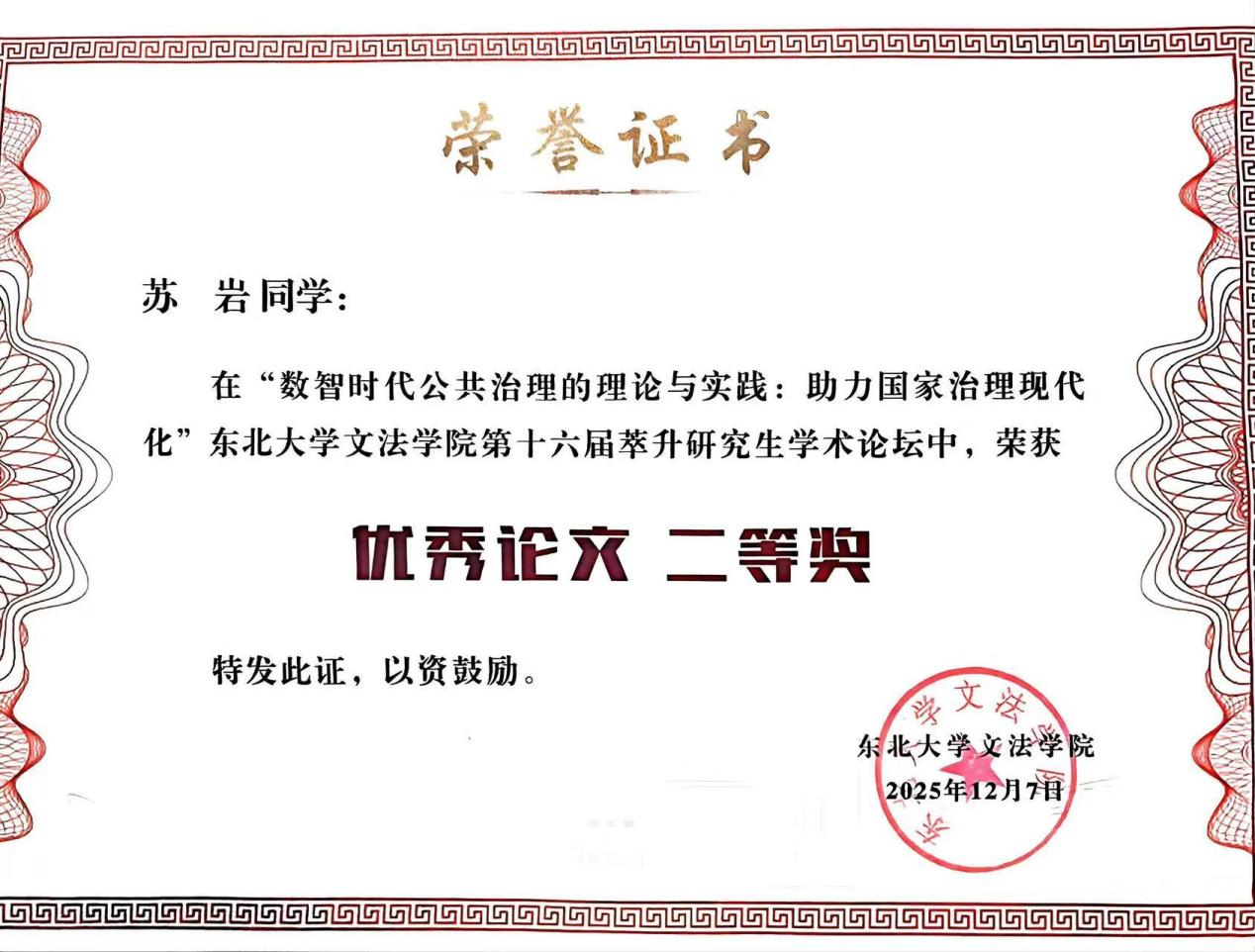 为深入学习贯彻习近平法治思想,聚焦“数智时代公共治理的理论与实践:助力国家治理现代化”这一核心议题,促进法学研究创新发展与高层次人才交流,东北大学于12月7日举办第十六届“萃升”研究生学术论坛。论坛汇聚全国多地高校专家学者和青年研究力量,共同探讨数字化变革背景下的国家治理与法治建设等前沿问题主播福利 2024级法律硕士研究生苏岩获本次学术论坛“优秀论文二等奖”,并受邀出席交流。