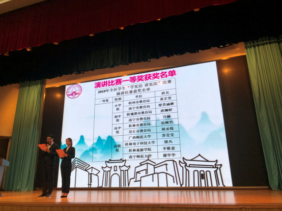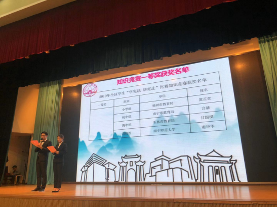 全国学生“学宪法 讲宪法”活动由教育部主办,活动全面覆盖了31个省(区、市)、新疆生产建设兵团和香港、澳门特别行政区,大中小学各学段。此次广西选拔赛由广西教育厅主办,广西师范大学承办,参赛者由广西区内各大高校和各市教育局选派,组成高校、高中、初中、小学四个小组分别比赛,演讲比赛分为主题演讲与命题演讲环节,知识竞赛分为必答题抢答题与你划(话)我猜环节。76名优秀选手进行了为期两天的激烈角逐,最后决出了演讲比赛一等奖小学、初中、高中组各2名,高校组4名,知识竞赛一等奖小学、初中、高中、高校组各1名,并选拔出5名选手组成广西代表队参加11月在北京举行的全国总决赛。