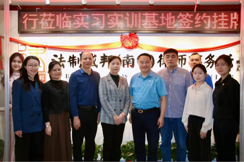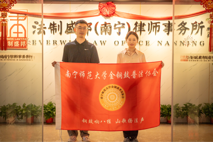 与广东法制盛邦(南宁)律师事务所举行法学专业教学实践基地签约暨揭牌仪式。金铜鼓普法协会主要负责人尹彭媛、陈友林、赵滢滢参加此次合作共建活动,与律所共同探讨合作推进广西青少年法治宣传教育的高质量发展。