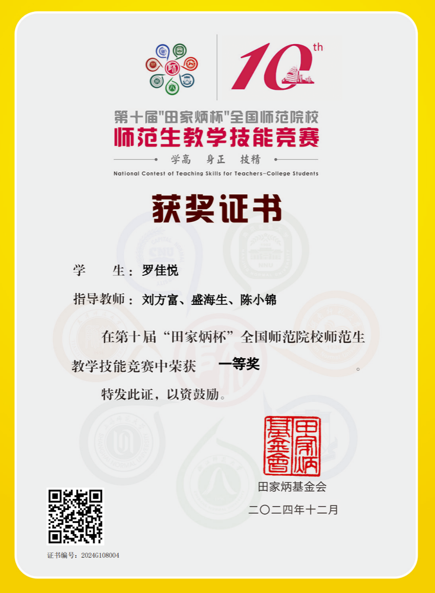 2021级历史学本科专业罗佳悦同学荣获全国师范院校师范生教学技能大赛决赛一等奖。