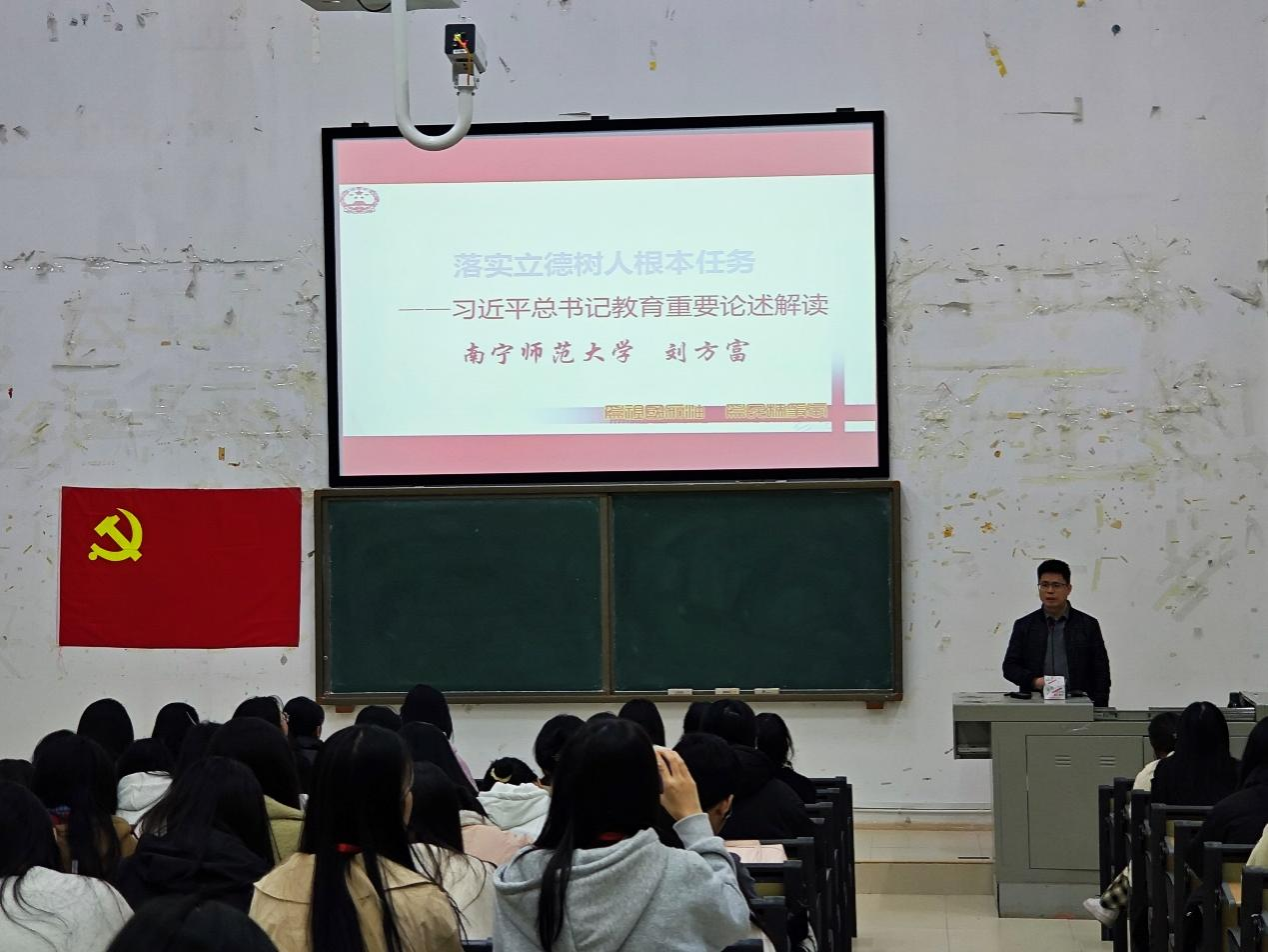 在第三讲课中,刘方富教授以落实立德树人根本任务为主题-习近平总书记教育重要论述解读,围绕什么是素养、培养什么人、立什么德及如何立德树人等方面进行论述。指出教育改革要从问题出发,要树立多样化的人才管理体系,更要致力于德智体美劳全面发展。刘教授将习近平总书记教育重要论述归纳为四个方面:一个核心、两翼驱动、三个抓手、四个保障,启示我们应树立正确的价值观,做“四有”好老师。