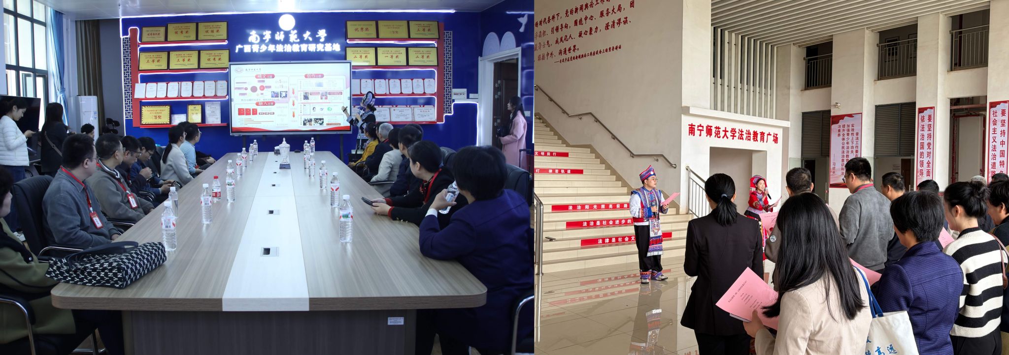 经济与管理学院党建文化走廊、初等教育学院明德史馆、生命之美标本馆、非遗工作室和广西青少年法治教育基地,并在基地前合影留念。