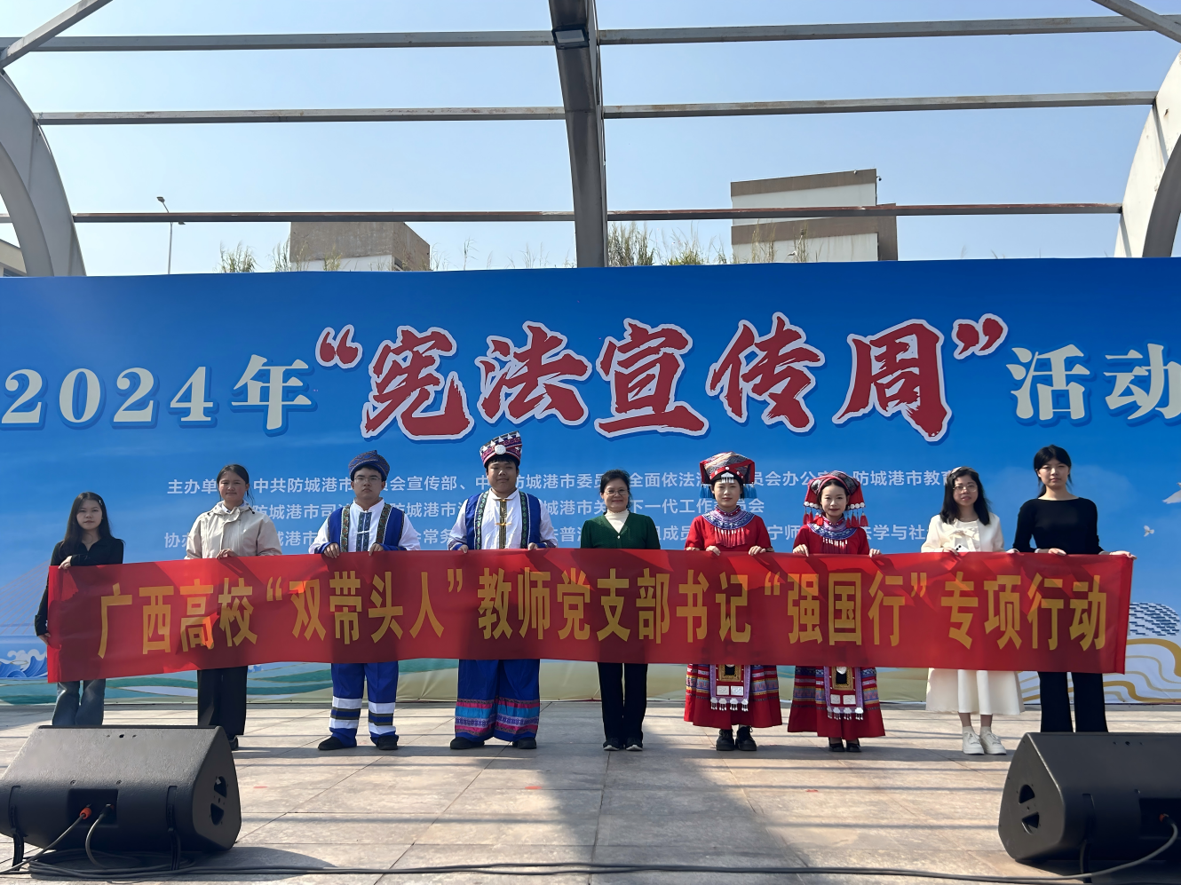 广西高校“双带头人”教师党支部书记“强国行”专项行动团队负责人陈文琼教授带领协会成员参加在防城港理工职业学校举办的2024年“12·4 国家宪法日宣传周活动”启动仪式。